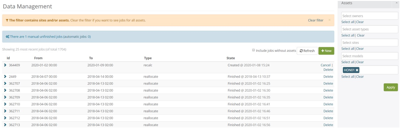 Click the new button to create a new job. The use then filter to select the time interval and assets.