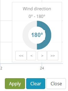 When pressing the Filter wind direction button in the bottom right of the chart area, a wind-direction widget will appear.