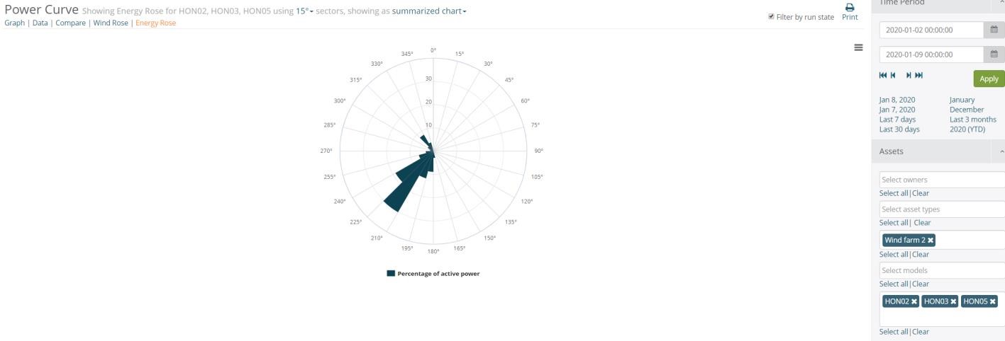 The Energy Rose chart gives a succinct view of how active power and direction are distributed at the asset location. The directions of the rose with the longest spoke show the highest active power.