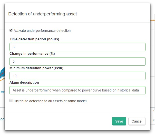 This configuration set the difference in percent that is needed to trigger an underperforming alarm. The trigger is based on the difference between actual production and theoretical production using the active theoretical power curve.