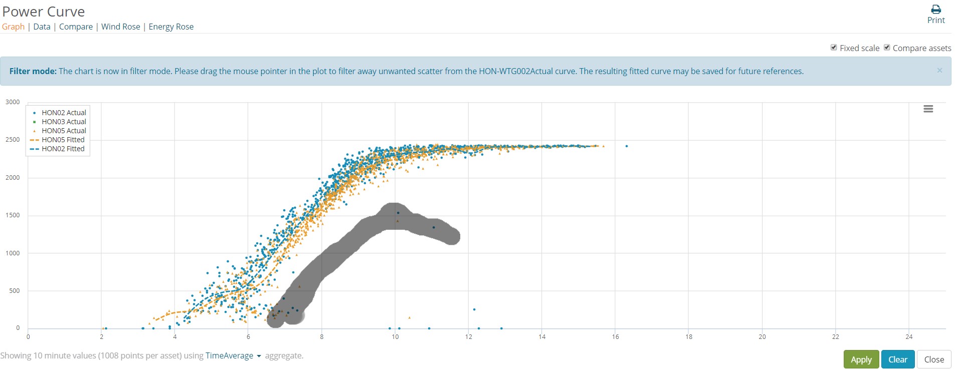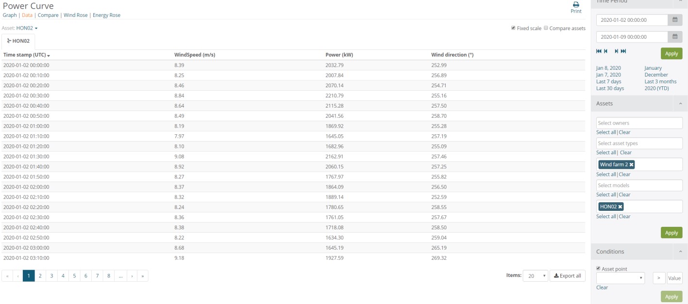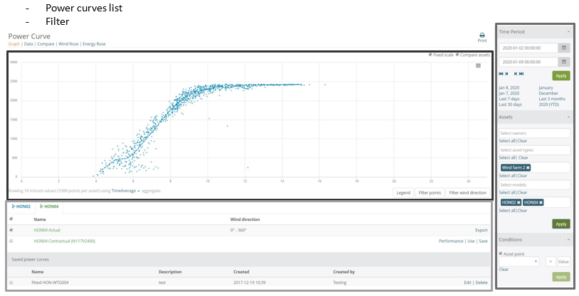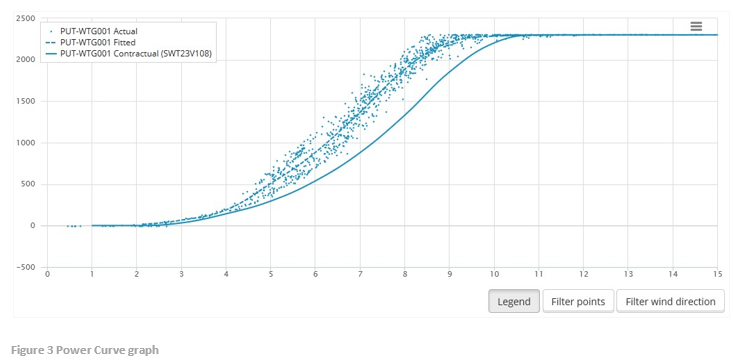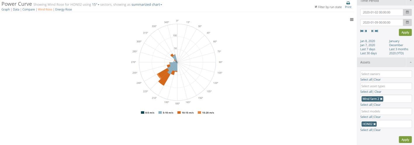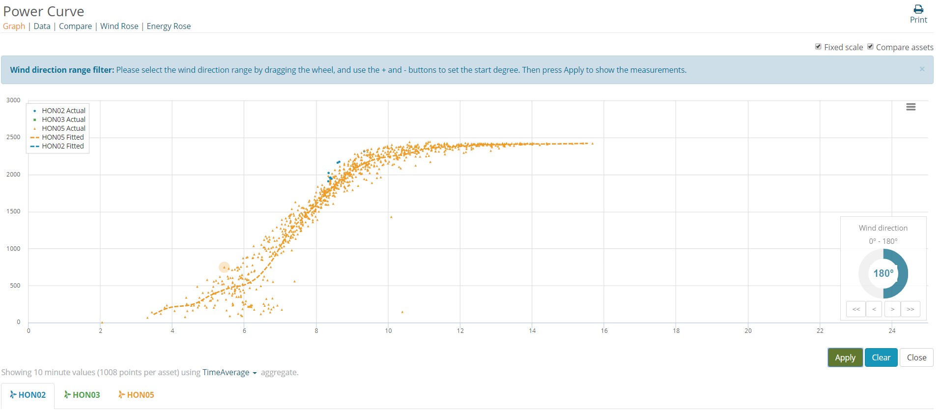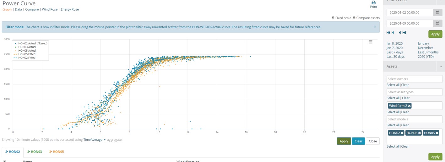 The Power curve analyzer includes a wind-direction filter that enables visualization of power curves filtered by any windrange.