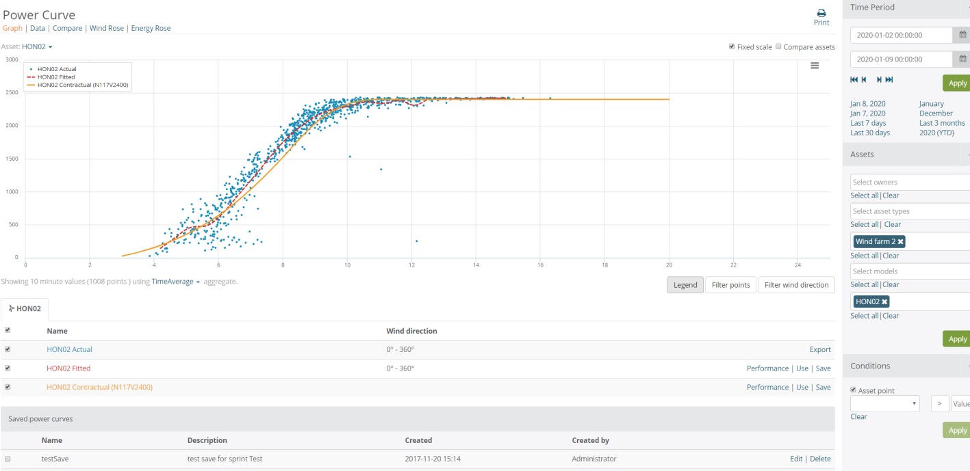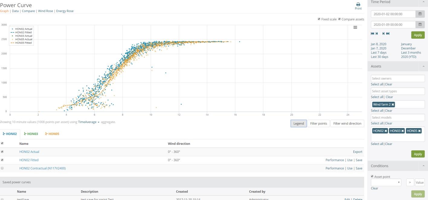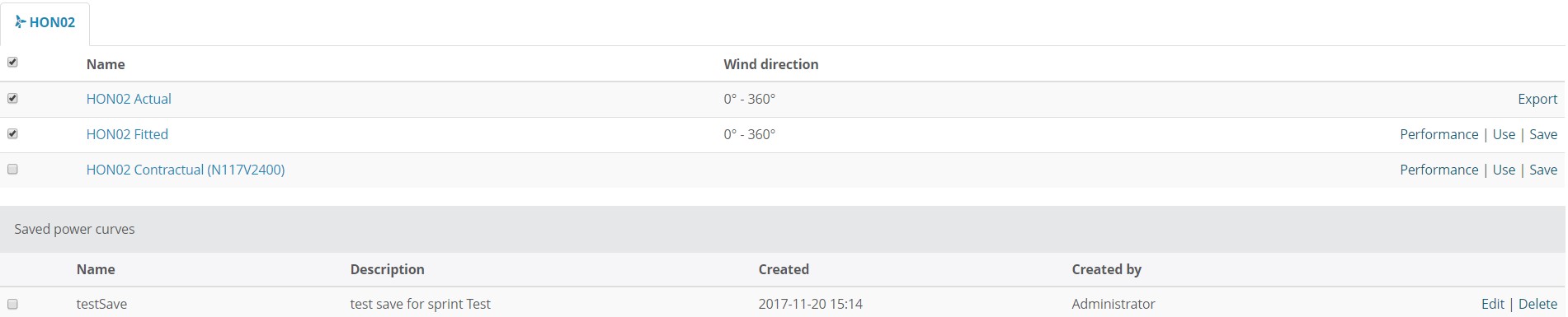 The fitted and contractual power curves may be saved by clicking the Save link-button. The saved power curves will then appear in the saved power curves list, and may then be loaded into the graph at any time for comparison.
