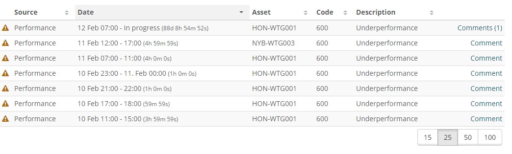 Side-note: Could be extended to support other types of underperformance such as ice-detection, nacelle misalignment, as examples. For each new alarm-type a trigger-calculation must be set up. Each turbine vendor have different sets of tags available so these triggers must be configured on customers request.