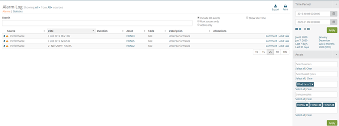 Alarm log is an efficient application for look up, analysis and reporting for all alarms and warnings from any of the turbines in the system. The filter is used to easily select desired turbines and time-periods.