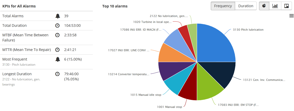 By default the report displays the most common alarms by how many times the appeared (frequency). By switching to duration, the report shows the ratio between the length of the overall time of the alarms.