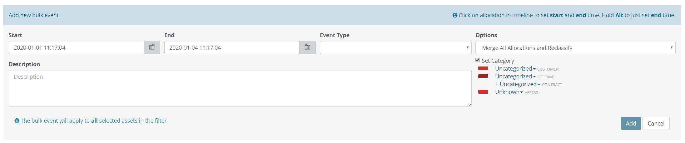 It is possible to add a bulk event that will affect all selected assets in the filter in the given time period.