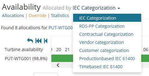 By default the system is configured with two different allocation categorizations, Timebased IEC and Contractual Categorization. However, the number of categorizations is dynamic and based on the alarm configuration file imported for each turbine type individually. Visualization of allocations in the application such as colors and categorization names are also configurable. The picture below shows an example of some categorizations.
