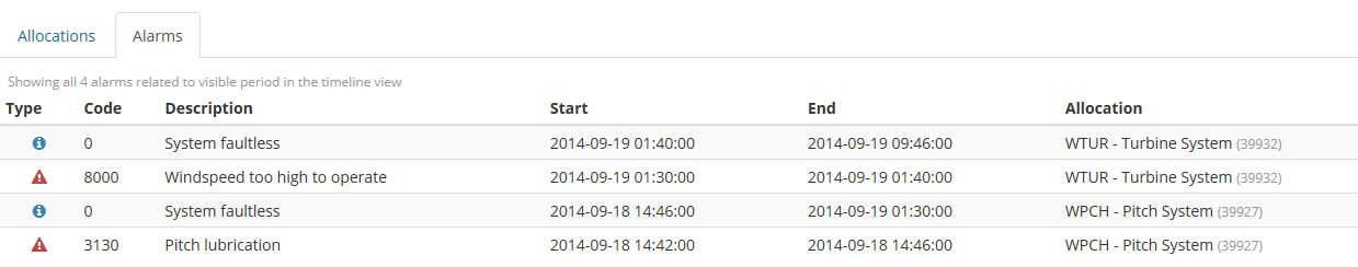 All alarms related to the chosen turbine for a given site during a filtered period are presented in an alarm list that appears as you click on the Alarms tab folder in the application. An example alarm list is shown in the screen below.