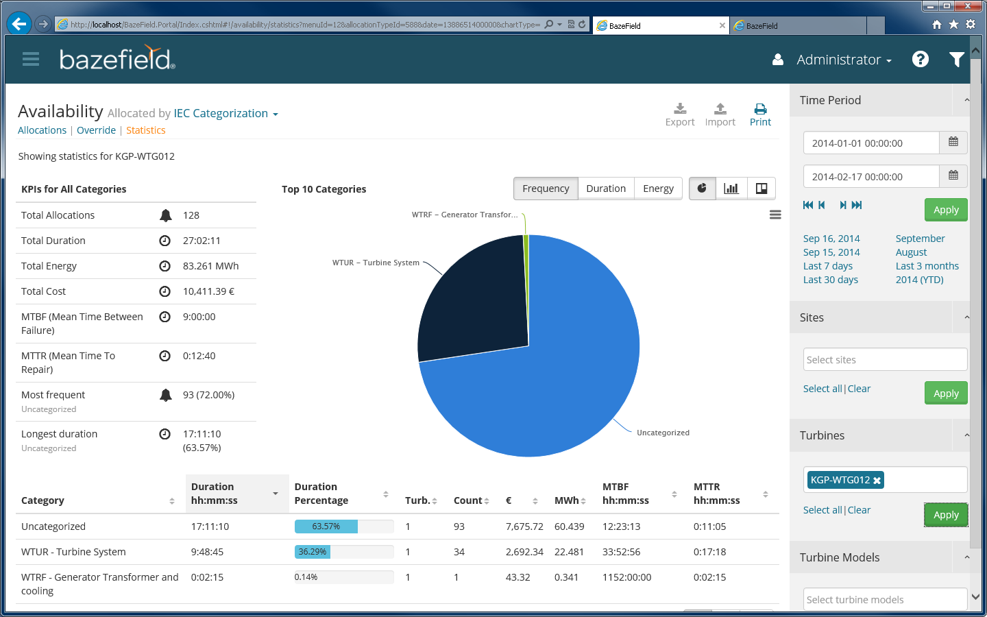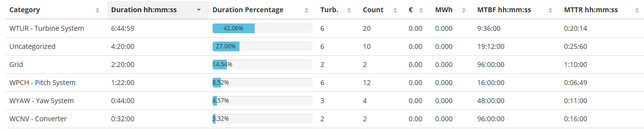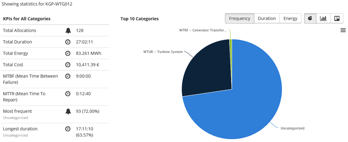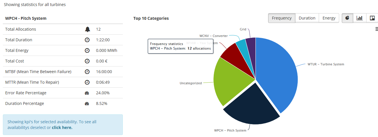 The application supports multiple availability calculations and categorizations views. Both IEC 61400-25 (time based) and IEC 61400-26 (production based) is included by default, but other classifications can easily be configured. This can be contractual, ISP contractual, technical categorizations according to IEC 61400 or RDS-PP etc.